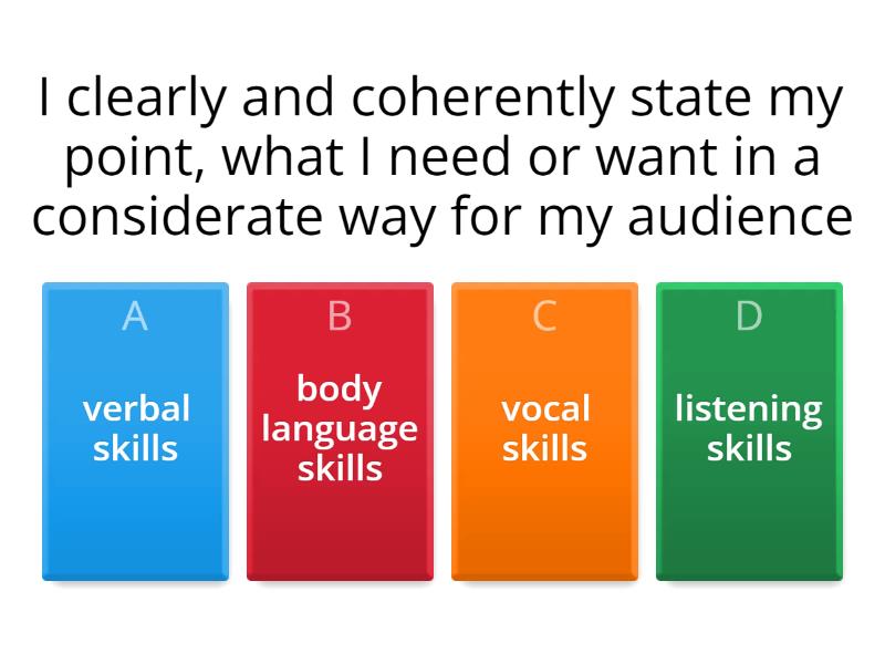1) I clearly and coherently state my point, what I need or want in a considerate way for my audience a) verbal skills b) body language skills c) vocal skills d) listening skills 2) I pay attention to the other person’s non-verbal communication a) verbal skills b) body language skills c) vocal skills d) listening skills 3) I prepare to actively listen before meeting others a) verbal skills b) body language skills c) vocal skills d) listening skills 4) I use tone, pitch and pace to sound interested and confident and to engage and connect with my audience a) verbal skills b) body language skills c) vocal skills d) listening skills 5) I use sentence stress, pausing and tone to convey the meaning of my message a) verbal skills b) body language skills c) vocal skills d) listening skills 6) I use gestures to reinforce the meaning of my word a) verbal skills b) body language skills c) vocal skills d) listening skills 7) I ask different question types to show interest, clarify understanding and build rapport a) verbal skills b) body language skills c) vocal skills d) listening skills 8) I show I understand by acknowledging the speaker’s thinking and feelings a) verbal skills b) body language skills c) vocal skills d) listening skills 9) Which one of these is not a communication preference? a) direct b) reserved c) business first d) calm e) energetic f) analytic 10) Which communication preference would rather 1-to-1 interactions? a) direct b) demonstrative c) reserved d) calm 11) Which communication preference tends to use a 'tell' approach? a) direct b) demonstrative c) calm d) business first 12) Which communication preference finds it difficult to have long silences in conversation? a) direct b) demonstrative c) calm d) business first 13) True or False? You need to understand your own communication style preferences to be able to connect better with others. a) True b) False 14) True or False? Some communication styles are more appropriate in the workplace than others. a) True b) False 15) Changing or adapting your behaviour to preference to communicate better with someone who has different communication preferences to yours is called a) flexing b) flipping c) formulating 16) Which of these is not a way to flex your communication style to work better with others? a) Avoid certain topics b) As more/less questions (depending on their preference) c) Find preferences that you have in common and leverage them to build rapport d) Mirror their body language e) Observe others to identify their communication preferences f) Continue communicating your way - they'll get used to it!