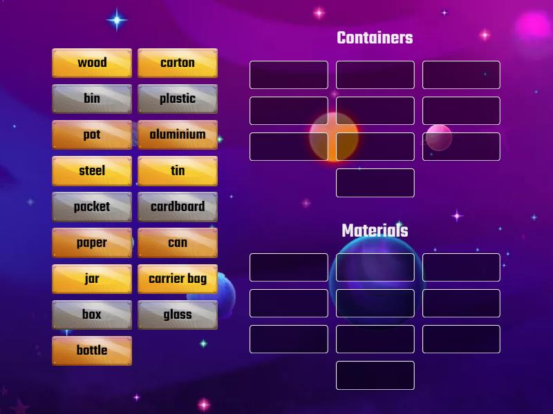 Containers: can, carrier bag, bin, tin, bottle, box, pot, carton, jar, packet, Materials: aluminium, cardboard, glass, paper, plastic, steel, wood,