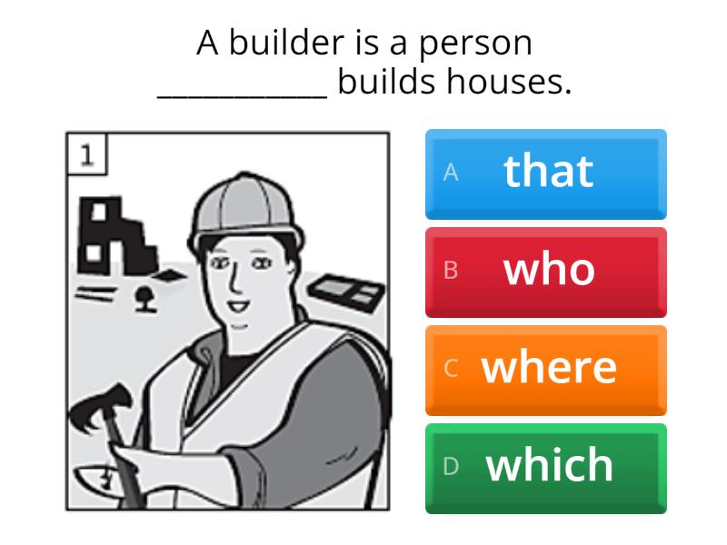 1) A builder is a person ___________ builds houses. a) that b) who c) where d) which 2) A hairstylist is somebody ___________ cuts your hair. a) that b) who c) where d) which 3) A library is a place _________ you can read or borrow books. a) who b) where c) that d) which 4) A campsite is a place __________ people sleep in tents. a) that b) where c) who d) which 5) Mugs are things __________ you drink from. a) where b) who c) that d) which 6) An iPod is something ________ you listen to music with. a) who b) where c) that d) which 7) An architect is someone __________ designs buildings. a) where b) that c) who d) which 8) An internet cafe is a place ________ you can send emails and drink a coffee. a) where b) who c) that d) which 9) An art gallery is a place ________ you look at paintings. a) who b) that c) where d) which 10) Sneakers are shoes __________ people wear for sports. a) where b) who c) that d) which 11) A bookstore is a place __________ you can buy books. a) who b) where c) that d) which 12) Scissors are things __________ you use to cut paper with. a) that b) who c) which d) where 13) Lipstick is something ________ you put on your lips. a) which b) that c) where d) who 14) A pilot is a person __________ flies planes. a) who b) that c) where d) which 15) A tourist is a person ___________ visits another country. a) which b) who c) that d) where