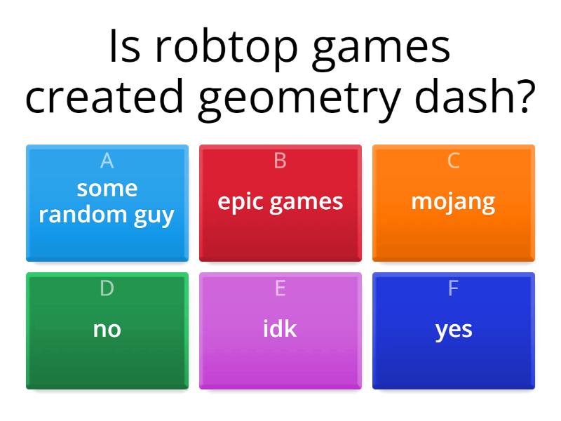 1) Is robtop games created geometry dash? a) yes b) no c) mojang d) idk e) epic games f) some random guy 2) when he maked it? a) 2011. may 24. b) 1998. december 21 c) 2034. september 11. d) 2024. february 9. e) 2013. agust 13. f) 3345. march 27 3) what is geometry dash's net worth a) $1m b) $8 c) 45,567,396 d) $0 e) $10,000 f) $10,651