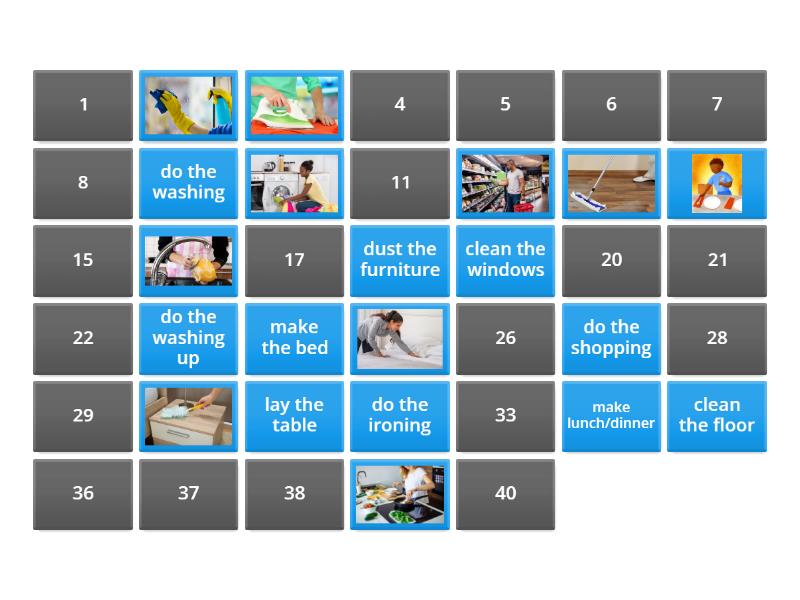clean the floor, clean the windows, do the ironing, do the shopping, do the washing, do the washing up, dust the furniture, lay the table, make lunch/dinner, make the bed, sweep the floor, take the rubbish out, tidy up, vacuum the carpet, clear the table, hang out the washing, put away the clothes, mop the floor, wash the car, mow the lawn,