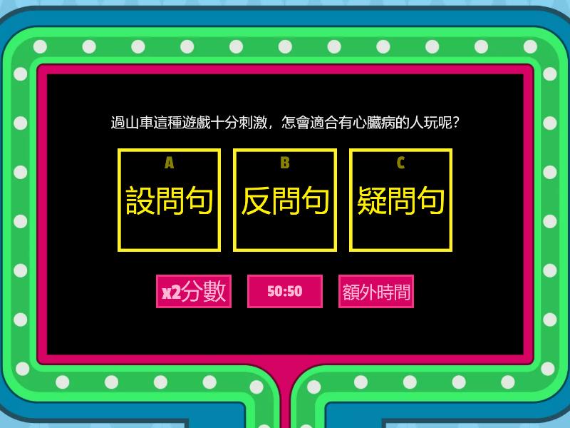 1) 過山車這種遊戲十分刺激,怎會適合有心臟病的人玩呢? a) 反問句 b) 設問句 c) 疑問句 2) 植物沒有泥土,還能不能生長呢? a) 設問句 b) 反問句 c) 疑問句 3) 我國的國旗是怎樣的?是一面五星紅旗。 a) 設問句 b) 反問句 c) 疑問句 4) 測驗的時候,我們應該怎麼做呢? a) 反問句 b) 設問句 c) 疑問句 5) 事實放在眼前,你怎麼可以抵賴呢? a) 反問句 b) 設問句 c) 疑問句 6) 為甚麼要增進知識?正因為知識就是力量。 a) 設問句 b) 反問句 c) 疑問句