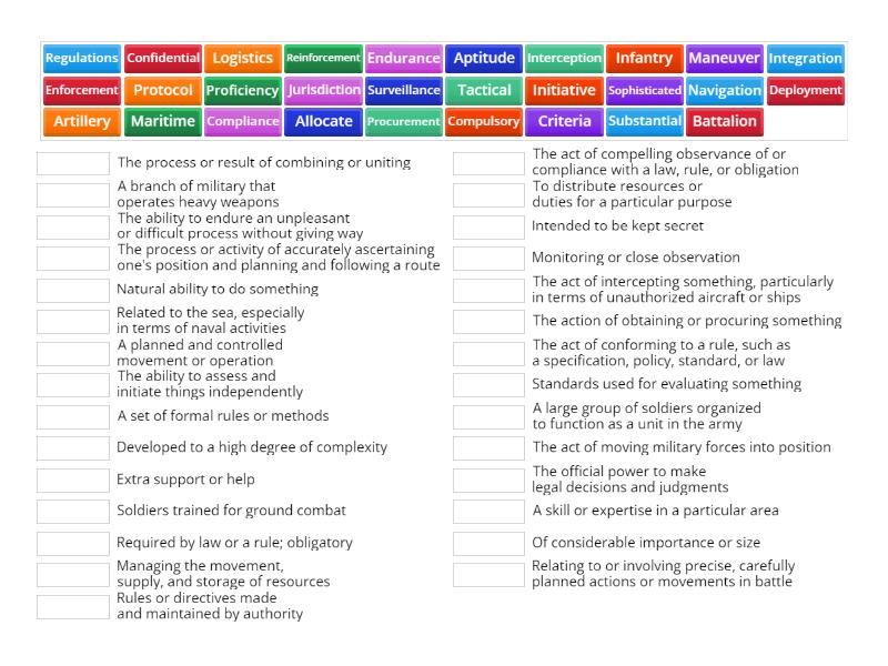 Criteria - Standards used for evaluating something, Surveillance - Monitoring or close observation, Maritime - Related to the sea, especially in terms of naval activities, Logistics - Managing the movement, supply, and storage of resources, Artillery - A branch of military that operates heavy weapons, Infantry - Soldiers trained for ground combat, Protocol - A set of formal rules or methods, Deployment - The act of moving military forces into position, Battalion - A large group of soldiers organized to function as a unit in the army, Maneuver - A planned and controlled movement or operation, Jurisdiction - The official power to make legal decisions and judgments, Enforcement - The act of compelling observance of or compliance with a law, rule, or obligation, Substantial - Of considerable importance or size, Regulations - Rules or directives made and maintained by authority, Allocate - To distribute resources or duties for a particular purpose, Compliance - The act of conforming to a rule, such as a specification, policy, standard, or law, Proficiency - A skill or expertise in a particular area, Endurance - The ability to endure an unpleasant or difficult process without giving way, Compulsory - Required by law or a rule; obligatory, Aptitude - Natural ability to do something, Reinforcement - Extra support or help, Procurement - The action of obtaining or procuring something, Tactical - Relating to or involving precise, carefully planned actions or movements in battle, Confidential - Intended to be kept secret, Interception - The act of intercepting something, particularly in terms of unauthorized aircraft or ships, Navigation - The process or activity of accurately ascertaining one's position and planning and following a route, Sophisticated - Developed to a high degree of complexity, Integration - The process or result of combining or uniting, Initiative - The ability to assess and initiate things independently,