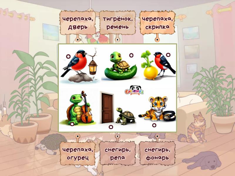 снегирь, фонарь, черепаха, скрипка , черепаха, огурец, черепаха, дверь, тигрёнок, ремень , снегирь, репа.