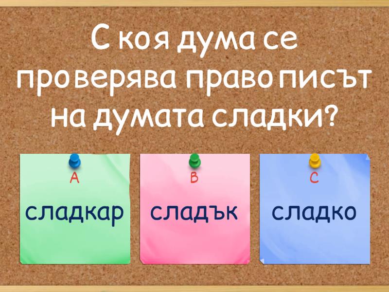 1) С коя дума се проверява правописът на думата сладки? a) сладкар b) сладък c) сладко 2) Каква част на речта е думата едно? a) съществително име b) прилагателно име c) числително име 3) В кое словосъчетание прилагателното име и съществителното име са съгласувани по род и число? a) съвременно дете b) близки игрище c) електронен списание 4) Коя дума правилно е разделена на части за пренасяне на нов ред? a) близк-ото b) тур-нир c) поч-ивката 5) Коя от думите е образувана с представка? a) родител b) разходя c) растеж 6) В кое изречение има дума с преносно значение? a) Спортистът тичаше бързо и спечели медала. b) Поточето тича през гъстата гора. c) Тя тичаше към спирката на автобуса. 7) В кое изречение е допусната грешка? a) Земята беше покрита със сняг. b) Той заби топката с челен удар. c) Всяка сутрин пия чай с захар. 8) Кое изречение е сложно? a) Зафучал вятърът и продължил нататък. b) В листата на дърветата пеят славеи и дроздове. c) На север дърветата растат здрави и силни. 9) С коя от думите се проверява правописът на думата град? a) градче b) градове c) градска 10) Коя от думите е с две представки? a) заплува b) Б) подрежда c) В) заподскача 11) В коя народна мъдрост има числително име? a) Колкото глави – толкова умове. b) Всяко чудо за три дни. c) Ден година храни 12) В кое словосъчетание прилагателното име може да се степенува? a) студени ръце b) майчин език c) дървено столче 13) В кое от словосъчетанията думите са съгласувани по род и по число? a) тесните релса b) чудното влак c) красивата природа 14) В кое изречение глаголът е употребен в преносно значение? a) На сутринта вятърът утихна. b) Слънцето се усмихна. c) Дърветата вече разцъфнаха. 15) Кое изречение е сложно? a) Не разчитай нито на кошчета, нито на чистачи! b) Погрижи се за почистването на боклука си! c) Вземи отпадъците и ги изхвърли в контейнера! 16) Кое изречение изразява заповед? a) Играй си с мен, моля те! b) Деца, не късайте цветята! c) Ако обичаш, дай ми книгата! 17) В кой ред прилагателните имена са антоними? a) гол – бос b) стара – немощна c) бърз – бавен 18) В кое изречение има дума, употребена в преносно ? a) Лукът в салата е лют. b) Не обичам люти чушки. c) Лют студ скова земята. 19) В кой ред думите са сродни? a) къща, дом, сграда b) къща, къщичка, къщовница c) къща, прозорец, покрив 20) В кой ред има само съществителни имена? a) доброта, скачам, рисунка b) добър, лилия, бои c) Добринка, блок, Лилия
