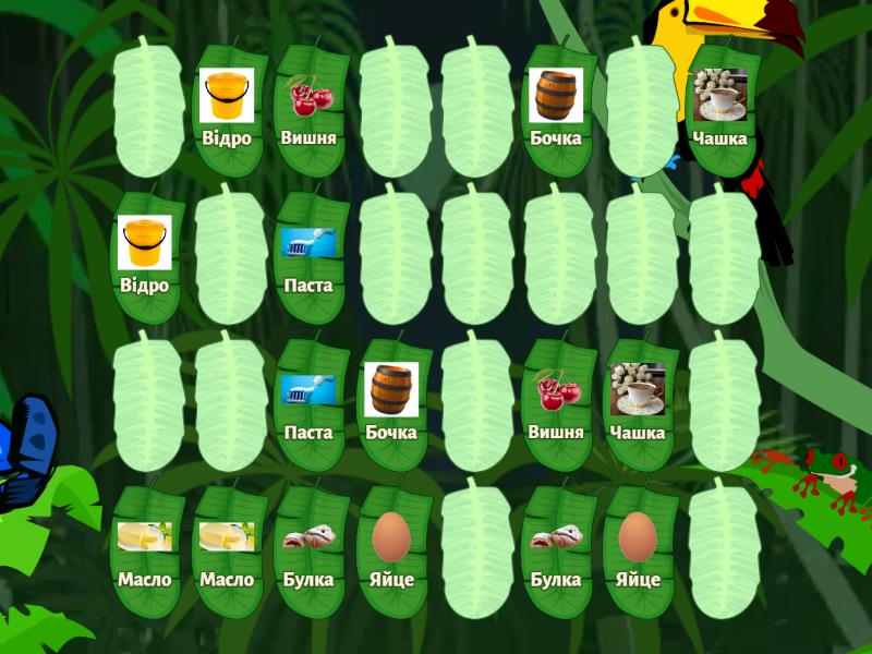 Масло, Паста, Яйце, Відро, Чашка, Булка, Вишня, Бочка, Мишка, Качка, Миска, Білка, Шорти, Таксі, Губка, Лампа,