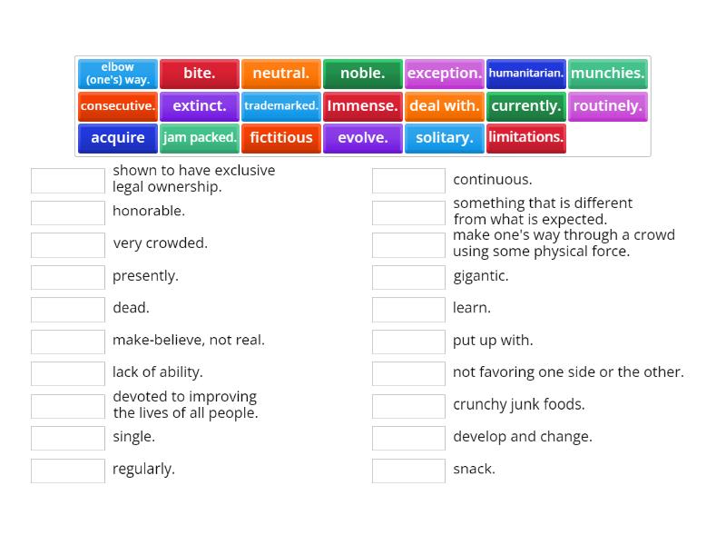 acquire - learn. , consecutive. - continuous. , currently. - presently. , extinct. - dead. , Immense. - gigantic. , routinely. - regularly. , solitary. - single. , jam packed. - very crowded. , elbow (one's) way. - make one's way through a crowd using some physical force. , munchies. - crunchy junk foods. , deal with. - put up with. , bite. - snack. , evolve. - develop and change. , exception. - something that is different from what is expected. , fictitious - make-believe, not real. , humanitarian. - devoted to improving the lives of all people. , limitations. - lack of ability. , neutral. - not favoring one side or the other. , noble. - honorable. , trademarked. - shown to have exclusive legal ownership. ,