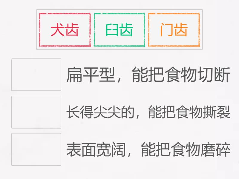 臼齿 - 长得尖尖的,能把食物撕裂, 犬齿 - 扁平型,能把食物切断, 门齿 - 表面宽阔,能把食物磨碎,