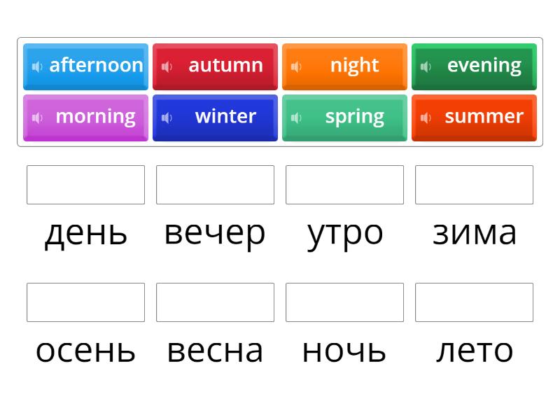 morning - утро, afternoon - день, evening - вечер, night - ночь, summer - лето, autumn - осень, winter - зима, spring - весна,
