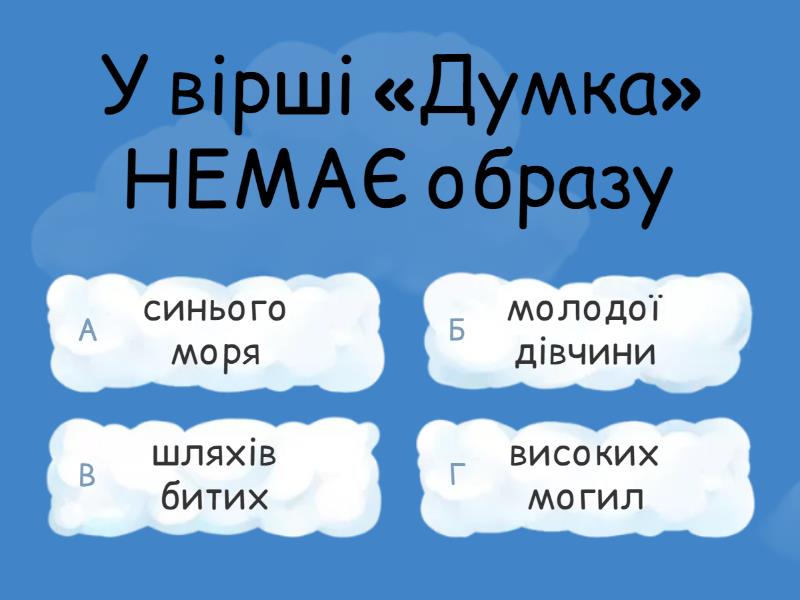 1) У вірші «Думка» НЕМАЄ образу a) синього моря b) молодої дівчини c) шляхів битих d) високих могил 2) У вірші «Думка» згадано усіх близьких для козака людей, ОКРІМ a) коханої дівчини b) сестри c) батька d) матері 3) Вірш «Думка» — це: a) поезія-роздум; b) поезія-гімн c) поезія-марш d) поезія в прозі 4) Тарас Шевченко відомий під псевдонімом: a) Лірник b) Бандурист c) Кобзар d) Гітара 5) Що є основною темою поезії "Думка" ("Тече вода в синє море")? a) Слава і героїзм козаків b) Відображення природних явищ c) Любов до рідної землі d) Трагедія українського народу 6) Яке основне почуття викликає поезія "Думка" ("Тече вода в синє море")? a) Смуток b) Радість c) Надія d) Віра