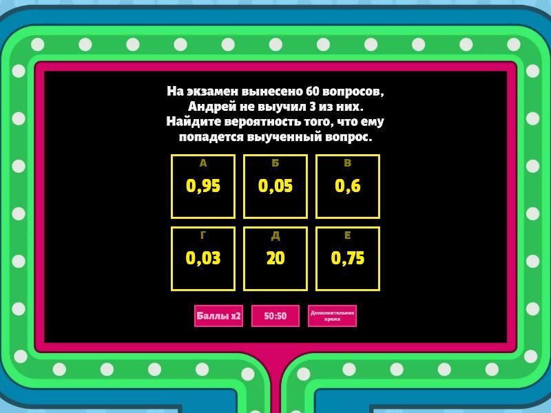 1) На экзамен вынесено 60 вопросов, Андрей не выучил 3 из них. Найдите вероятность того, что ему попадется выученный вопрос. a) 0,95 b) 0,05 c) 0,6 d) 0,03 e) 20 f) 0,75 2) Маша включает телевизор. Телевизор включается на случайном канале. В это время по девяти каналам из сорока пяти показывают новости. Найдите вероятность того, что Маша попадет на канал, где новости не идут. a) 0,2 b) 0,3 c) 0,8 d) 0,5 e) 5 f) 0,7 3) В фирме такси в данный момент свободно 20 машин: 10 черных, 2 желтых и 8 зеленых. По вызову выехала одна из машин, случайно оказавшаяся ближе всего к заказчице. Найдите вероятность того, что к ней приедет зеленое такси. a) 0,1 b) 0,3 c) 0,4 d) 0,7 e) 0,5 f) 0,6 4) На тарелке 16 пирожков: 7 с рыбой, 5 с вареньем и 4 с вишней. Юля наугад выбирает один пирожок. Найдите вероятность того, что он окажется с вишней. a) 0,5 b) 0,4 c) 0,75 d) 0,25 e) 0,65 f) 0,1 5) Родительский комитет закупил 30 пазлов для подарков детям на окончание учебного года, из них 12 с картинками известных художников и 18 с изображениями животных. Подарки распределяются случайным образом. Найдите вероятность того, что Вове достанется пазл с животным. a) 0,4 b) 2,5 c) 0,5 d) 0,32 e) 0,6 f) 0,7 6) В случайном эксперименте бросают две игральные кости. Найдите вероятность того, что в сумме выпадет 8 очков. Результат округлите до сотых. a) 0,13 b) 0,87 c) 0,85 d) 0,14 e) 0,15 f) 0,86 7) В случайном эксперименте симметричную монету бросают дважды. Найдите вероятность того, что орел выпадет ровно один раз. a) 0,4 b) 0,25 c) 0,1 d) 0,5 e) 0,75 f) 0,9 8) В чемпионате по гимнастике участвуют 20 спортсменок: 8 из России, 7 из США, остальные — из Китая. Порядок, в котором выступают гимнастки, определяется жребием. Найдите вероятность того, что спортсменка, выступающая первой, окажется из Китая. a) 0,75 b) 0,5 c) 0,6 d) 0,25 e) 0,3 f) 0,2 9) В среднем из 1000 садовых насосов, поступивших в продажу, 5 подтекают. Найдите вероятность того, что один случайно выбранный для контроля насос не подтекает. a) 0,005 b) 0,995 c) 0,2 d) 0,04 e) 0,96 f) 0,95 10) Фабрика выпускает сумки. В среднем на 100 качественных сумок приходится восемь сумок со скрытыми дефектами. Найдите вероятность того, что купленная сумка окажется качественной. Результат округлите до сотых. a) 0,07 b) 0,6 c) 0,93 d) 0,5 e) 0,2 f) 0,98