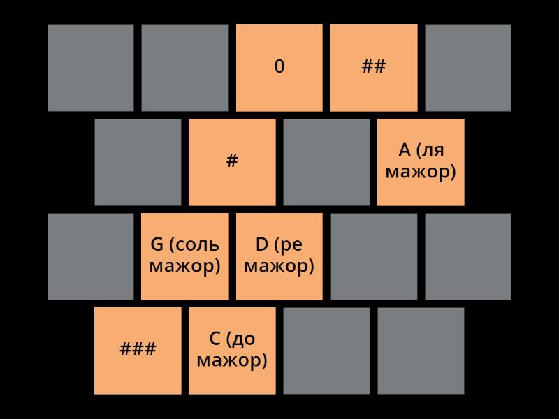 C (до мажор) - 0, G (соль мажор) - #, D (ре мажор) - ##, A (ля мажор) - ###, E (ми мажор) - ####, F (фа мажор) - ♭, B (си ♭ мажор) - ♭♭, Es (ми ♭ мажор) - ♭♭♭, As (ля ♭ мажор) - ♭♭♭♭,