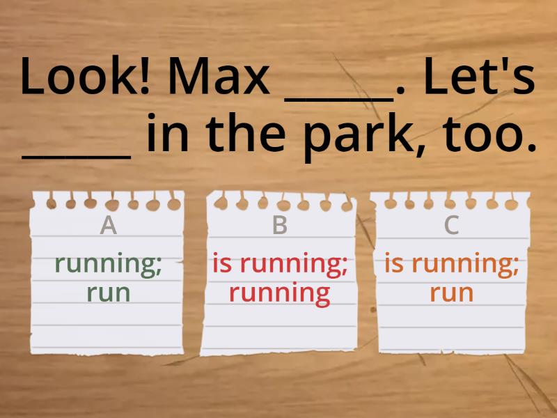 1) A: Are you _____ with Shawn? B: Yes, I am. a) chat b) chating c) chatting 2) I _____, and my sons _____. a) am reading; is playing b) am reading; are playing c) am read; is play 3) A: Are you cooking? B: Yes, _____. a) I are b) I cook c) I am 4) A: Are John and Kate dancing? B: No, _____. a) they aren't b) they can't c) they're dancing 5) A: _____ Jane doing? B: She's sleeping. a) Is b) What is c) Can 6) A: Is your mom talking to Aunt Lisa? B: _____. a) Yes, she can talk. b) She is not talking. c) No, she's not. 7) Sofie can _____ songs. She is _____ a song now. a) write; writing b) writing; writing c) writing; write 8) Lucas isn't _____ on the chair now. He's on the ground. a) sit b) siting c) sitting 9) A: Don't _____ a photo here! B: I'm not _____ a photo. a) taking; take b) take; taking c) taking; taking 10) Look! Max _____. Let's _____ in the park, too. a) running; run b) is running; running c) is running; run