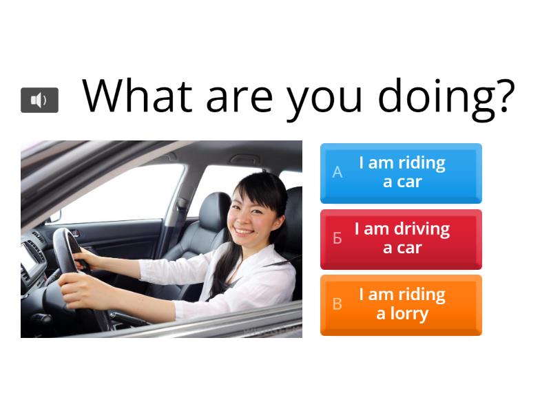 1) What are you doing? a) I am riding a car b) I am driving a car c) I am riding a lorry 2) What are you doing? a) I am driving a plane b) I am flying a helicopter c) I am flying a plane 3) What are you doing? a) I am driving a bike b) I am riding a lorry c) I am driving a lorry 4) What are you doing? a) I am riding a motorbike b) I am flying a motorbike c) I am riding a bike 5) What are you doing? a) I am riding a bus b) I am driving a bus c) I am driving a car 6) What are you doing? a) I am driving a helicopter b) I am flying a kite c) I am flying a helicopter 7) What are you doing? a) I am flying a kite b) I am jumping c) I am walking 8) What are you doing? a) I am driving a car b) I am sitting in a boat c) I am flying a plane