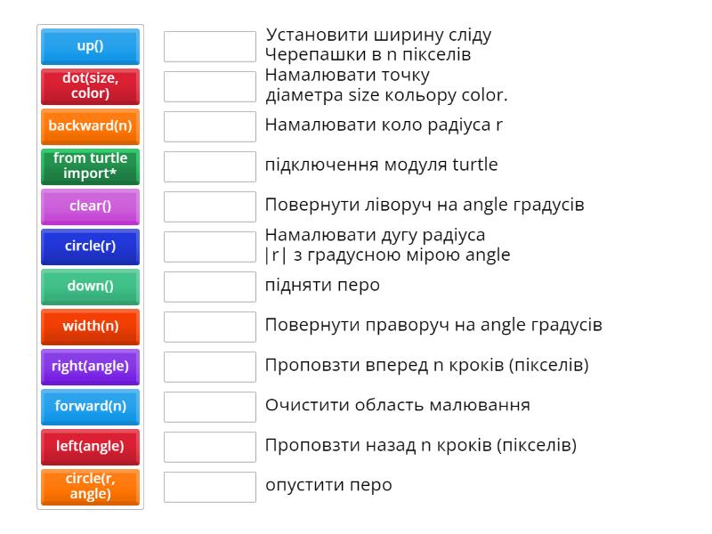 from turtle import* - підключення модуля turtle, down() - опустити перо, up() - підняти перо, width(n) - Установити ширину сліду Черепашки в n пікселів, forward(n) - Проповзти вперед n кроків (пікселів), left(angle) - Повернути ліворуч на angle градусів, right(angle) - Повернути праворуч на angle градусів, circle(r) - Намалювати коло радіуса r, circle(r, angle) - Намалювати дугу радіуса |r| з градусною мірою angle, dot(size, color) - Намалювати точку діаметра size кольору color. , clear() - Очистити область малювання, backward(n) - Проповзти назад n кроків (пікселів),
