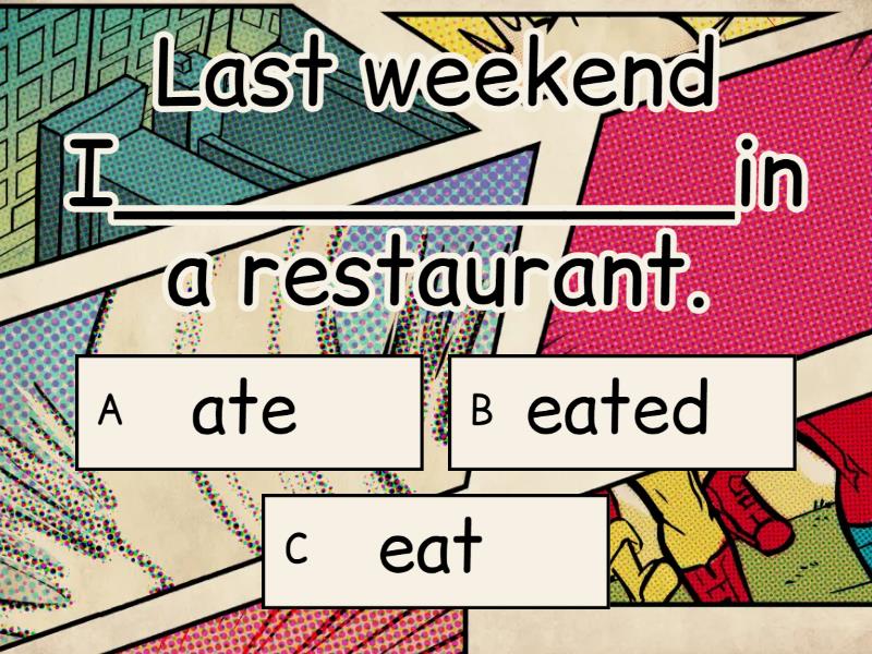 1) Last weekend I___________in a restaurant. a) ate b) eated c) eat 2) Last weeked I __________the house. a) clean b) cleaned c) clone 3) I__________my English homework last weekend. a) did do b) do c) did 4) I __________________the laundry yesterday. a) didn't do b) didn't c) don't did 5) I______________and _______________movies last Sunday. a) download, watch b) downloaded, watched c) download, watched 6) I _______________exercise last weekend. a) didn't exercised b) didn't exercise c) not exercised 7) I ____________my bicycle last Saturday. a) ride b) rided c) rode 8) I ___________visit relatives last weekend. a) not visited b) didn't visited c) didn't visit 9) I___________shopping and _______________new shoes last weekend. a) goed, buyed b) went, bought c) go, buy 10) It_________________all day on Sunday. a) rained b) rain c) is raining 11) I_______________ to the beach on my vacation. a) didn't went b) didn't go c) not went 12) ______________________on vacation last summer? a) Did you go b) You went c) You goed 13) What ___________________last weekend? a) are you doing b) did you do c) are you going to do 14) _____________________this cake? -At a bakery in Green street. a) Where did you buy b) What did you buy c) When did you buy
