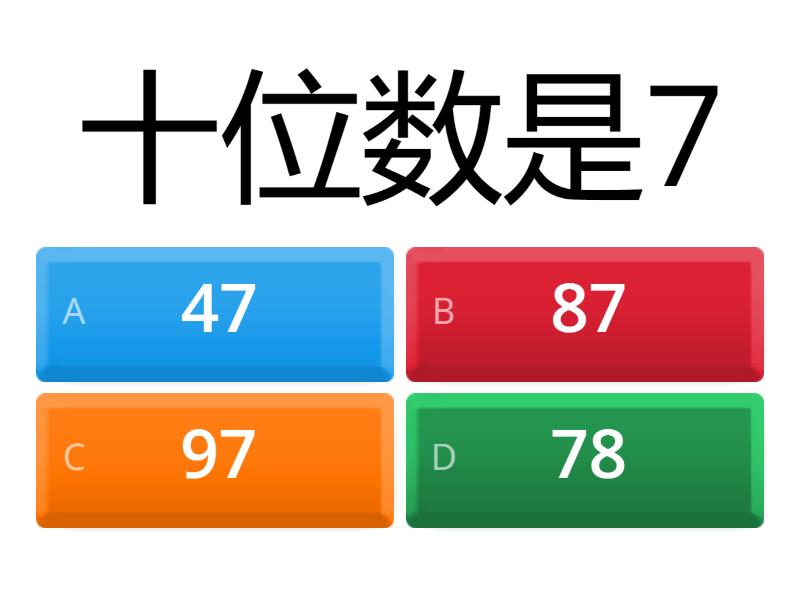 1) 十位数是7 a) 47 b) 87 c) 78 d) 97 2) 十位数是2 a) 12 b) 26 c) 32 d) 62 3) 个位数是5 a) 19 b) 87 c) 25 d) 92 4) 个位数是6 a) 66 b) 65 c) 63 d) 64 5) 50的十位近似值 a) 15 b) 54 c) 50 d) 60 6) 92的十位近似值 a) 89 b) 75 c) 90 d) 88 7) 75的十位近似值 a) 70 b) 80 c) 90 d) 100 8) 13的十位近似值 a) 40 b) 30 c) 20 d) 10 9) 44的十位近似值 a) 40 b) 50 c) 60 d) 44 10) 57的十位近似值 a) 30 b) 40 c) 50 d) 60