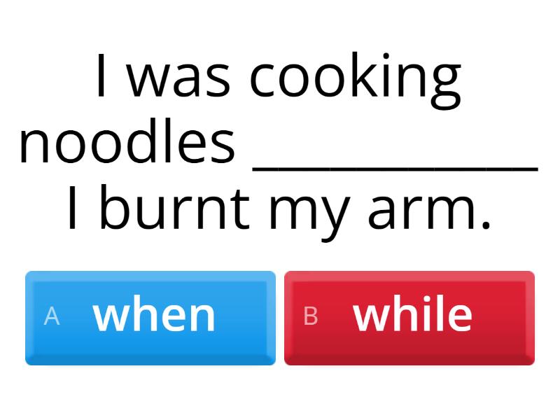 1) I was cooking noodles ___________ I burnt my arm. a) when b) while 2) Sam was doing his homework ______________ his brother was playing music loudly. a) when b) while 3) A man was talking on his mobile phone ___________ he was driving his van. a) when b) while 4) The store keeper __________________________ when the trolley hit him. a) talk to a customer b) talked to a customer c) was talking to a customer d) has talked to a customer 5) I was walking down the road when an old lady ______________________. a) gives me a banana b) gave me a banana c) was giving me a banana d) has given me a banana 6) I ____________________ in the queue when the robber _______________ into the bank. a) was waiting ... came b) wait ... come c) was waiting ... was coming d) waited ... was coming 7) The robber __________________ the money when the alarm __________________ off. a) took ... went b) took ... was going c) was taking ... was going d) was taking ... went 8) I _______________ on the phone while my sister __________________ TV. a) talk ... watches b) was talking ... was watching c) talked ... watched d) talked ... was watching