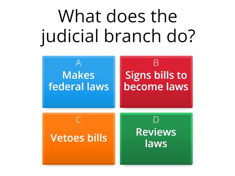 1) What is the supreme law of the land? a) The Declaration of Independence b) The Federalist Papers c) The Constitution d) The Bill of Rights 2) What do we call the first ten amendments to the Constitution? a) The Declaration of Independence b) The Federalist Papers c) The Constitution d) The Bill of Rights 3) The idea of self-government is in the first three words of the Constitution. What are these words? a) Freedom of Speech b) We the people c) Defines the government d) Secretary of State 4) How many amendments does the Constitution have? a) 10 b) 17 c) 20 d) 27 5) What does the Constitution do? a) Announced our independence b) Declared our independence c) Said that the United States is free d) Sets up the government 6) Who is in charge of the executive branch? a) The president b) Congress c) The supreme court d) Benjamin Franklin 7) Who signs bills to become laws? a) The president b) Congress c) The supreme court d) Benjamin Franklin 8) Who vetoes bills? a) The president b) Congress c) The supreme court d) Benjamin Franklin 9) Who makes federal laws? a) The president b) Congress c) The supreme court d) Benjamin Franklin 10) Who is the Commander in Chief of the military? a) The president b) Congress c) The supreme court d) Benjamin Franklin 11) What is the highest court in the United States? a) The president b) Congress c) The supreme court d) Benjamin Franklin 12) What does the judicial branch do? a) Makes federal laws b) Signs bills to become laws c) Vetoes bills d) Reviews laws 13) What are the two parts of the U.S. Congress? a) The Senate and the House of Representatives b) Checks and Balances c) Freedom of Speech and Freedom of Religion d) The executive and the legislative 14) What stops one branch of government from becoming too powerful? a) The Senate and the House of Representatives b) Checks and Balances c) Freedom of Speech and Freedom of Religion d) The executive and the legislative 15) How many U.S. Senators are there? a) 2 b) 6 c) 100 d) 435 16) We elect a U.S. Senator for how many years? a) 2 b) 6 c) 100 d) 435 17) We elect a U.S. Representative for how many years? a) 2 b) 6 c) 100 d) 435 18) The House of Representatives has how many voting members? a) 2 b) 6 c) 100 d) 435 19) Under our Constitution, some powers belong to the federal government. What is one power of the federal government? a) print money b) provide safety (fire departments) c) provide schooling and education d) give a driver's license 20) Under our Constitution, some powers belong to the states. What is one power of the states? a) print money b) declare war c) create an army d) give a driver's license