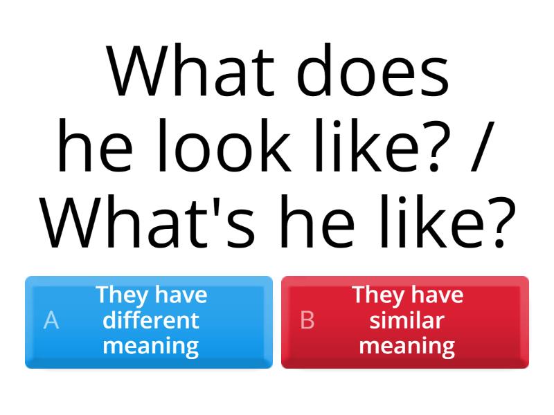 1) What does he look like? / What's he like? a) They have different meaning b) They have similar meaning 2) What does "potbelly" mean? a) having well-developed muscles b) a fat, round stomach 3) What does "instead" mean? a) happening immediately, without any delay b) as an alternative or substitute; in place of. 4) What does "on my way" mean? a) The process of going to a place. b) It is the condition of not arriving on time as agreed or expected. 5) What does "how come?" mean? a) Ask the method or process used for someone or something to arrive at a specific place. b) used to ask about the reason for something 6) What does "maiden name" mean? a) It's the family name she takes after getting married b) It's the family name she has before she gets married 7) In the question "What does the K stand for?", what does "stand for" mean? a) to be in a vertical state or to put into a vertical state b) to represent something 8) I just saw it the night before last. What does "before last" mean? a) on the day before today b) on the day before yesterday 9) What does "seat belts" mean? a) A device that slows down or stops a car b) Designed to protect passengers by holding you in your seat to reduce the risk of injury in the event of a crash. 10) Neither do I a) Yo tampoco b) Yo también 11) Was it any good? / What did you think of it? a) These questions ask permission to perform an action. b) These sentences ask someone’s overall impression of a topic, experience, or event. 12) What does "crowd" mean? a) Refers to a large group of people together in a particular place. b) an accident, usually a serious one in which the vehicle is damaged. 13) What does "make up your mind" mean? a) to decide what to do or choose b) to become mentally ill, or to start behaving in a silly or strange way 14) What does "taste" mean? a) to notice or discover something using the nose. b) the flavour of something, or the ability of a person or animal to recognize different flavours. 15) What does "lose track of the time." mean? a) to get distracted or forget to pay attention to the time, so they're not sure how much time has passed. b) to continue to be informed or know about someone or something 16) What does "help yourselves" mean? a) to give something to someone. b) to take something for yourself. 17) What does "disappointed" mean? a) to have the same opinion, or to accept a suggestion or idea b) unhappy because someone or something was not as good as you hoped or expected 18) What does "lie down" mean? a) a short rest, usually on a bed. b) to say or write something that is not true. 19) What does "tissues" mean? a) a small square piece of cloth or paper, used while you are eating to protect your clothes or to clean your mouth or fingers. b) soft paper that is used for cleaning, especially your nose, and is thrown away after use. 20) What does "keep in touch" mean" a) to continue looking for b) to communicate or continue to communicate with someone by using a phone or writing to them 21) I hate to break this up, but I've got to teach in fifteen minutes. What does "break up" mean? a) to interrupt or end something that is happening, especially a meeting, a conversation, or an activity. b) to destroy something in pieces or fragments. 22) What does "quite" mean? a) a lot or completely b) making very little noise c) to stop doing something or leave a job or a place 23) What does "willing" mean? a) the value, importance or usefulness of something or someone. b) to be happy to do something if it is needed. 24) What does "whose" mean? a) It's used to indicate possession or ownership. b) It's used to refer to a person or people when asking about or specifying them in a question or statement. It is used to inquire about someone's identity or to introduce