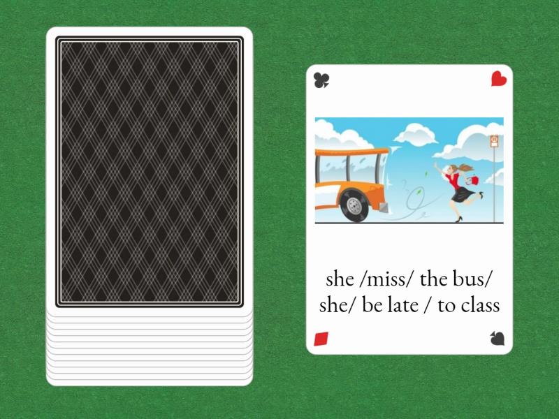 I/miss/ the train/ I/be late/ for class, she /miss/ the bus/ she/ be late / to class, you /study hard/ you/pass/ the test, you /not study / you/fail the test (USE A MODAL), he /study for the test/ he/not fail/ the test, I/ have time/later/ I / call/ my parents (USE A MODAL!), we/ wait / for her/ we / be late/ for the party, the borders/open/ this year/ we/ go to Spain (USE A MODAL!) , weather/not improve/we/not have/ a picnic, I / get/ home early/ we/ go / to a restaurant (USE A MODAL! ), she/stay /in London/ she/ get a new job (USE A MODAL), he/ ask me/ to marry him/ I /scream, you/break/ that vase/I be very angry.