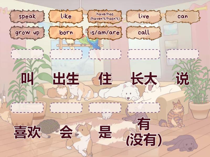 can - 会, speak - 说, is/am/are - 是, have/has (haven't/hasn't) - 有 (没有), like - 喜欢, call - 叫, live - 住, grow up - 长大, born - 出生,