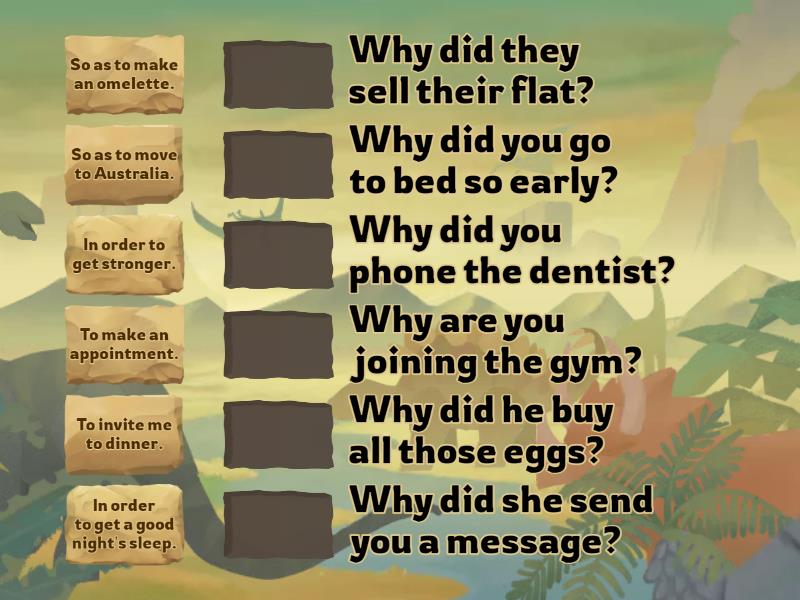 To invite me to dinner. - Why did she send you a message?, In order to get stronger. - Why are you joining the gym?, So as to make an omelette. - Why did he buy all those eggs?, In order to get a good night’s sleep. - Why did you go to bed so early?, To make an appointment. - Why did you phone the dentist?, So as to move to Australia. - Why did they sell their flat?,