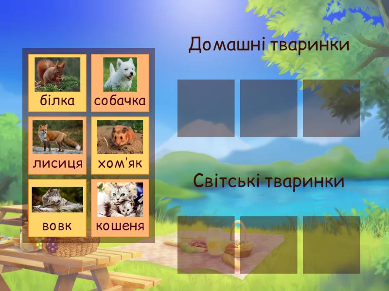 Домашні тваринки: кошеня , собачка , хомʼяк , Світські тваринки : вовк, лисиця , білка,