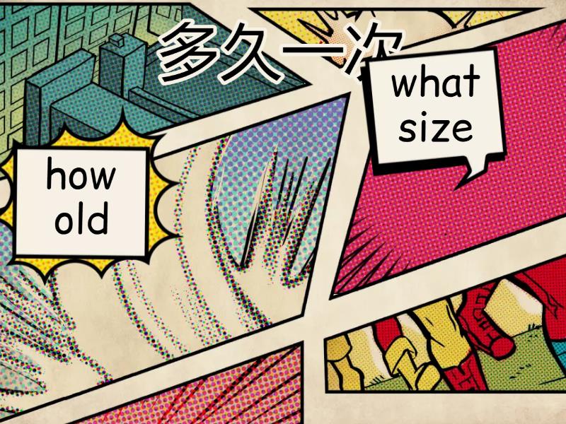 1) 什么 a) what b) how tall c) how d) how much 2) 谁 a) who b) what color c) what time d) where 3) 哪一个 a) which b) how soon c) how many d) what color 4) 谁的 a) whose b) how c) how soon d) what 5) 什么时候 a) when b) how many c) how far d) which 6) 在哪里 a) who b) what size c) where d) how many 7) 为什么 a) why b) how tall c) how d) where 8) 怎样,如何 a) where b) how c) how often d) how tall 9) 哪个班 a) what day b) how far c) what class d) how wide 10) 什么颜色 a) what colour b) how old c) what time d) how often 11) 多久(做某事)一次(问频率) a) how soon b) why c) what class d) how often 12) 几点(具体时刻) a) what b) what time c) how tall d) how heavy 13) 什么颜色 a) what class b) who c) what colour d) how long 14) 多长,多久(问花费时间) a) how long b) what long c) what far d) how far 15) 多久一次 a) how often b) what size c) what d) how old 16) 多少(可数) a) how old b) what grade c) how many d) what 17) 多少(不可数) a) how much b) what class c) when d) which 18) 多远 a) when b) what class c) which d) how far 19) 多少岁 a) where b) how old c) how heavy d) what 20) 多少钱 a) how heavy b) how much c) what class d) whose