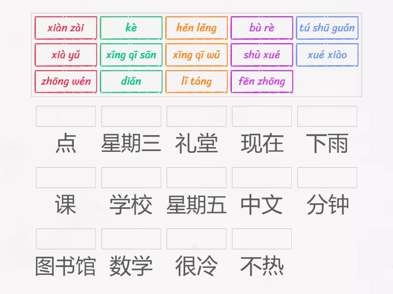 shù xué - 数学, zhōng wén - 中文, kè - 课, fēn zhōng - 分钟, diǎn - 点, xiàn zài - 现在, lǐ táng - 礼堂, tú shū guǎn - 图书馆, xué xiào - 学校, xīng qī wǔ - 星期五, xīng qī sān - 星期三, xià yǔ - 下雨, bù rè - 不热, hěn lěng - 很冷,