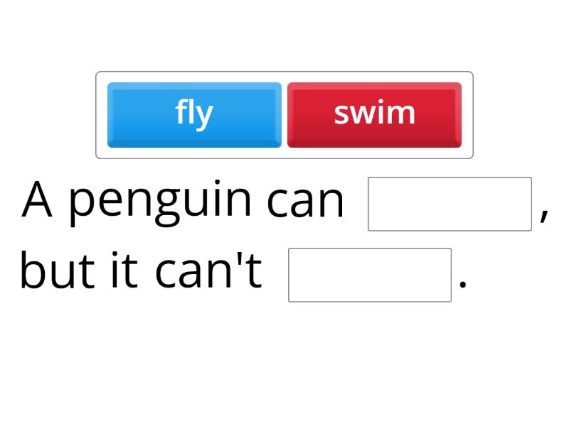A penguin can ____, but it can't ____. A monkey can ____, but it can't ____. A giraffe can ____, but it can't ____. An elephant can ____, but it can't ____. ____ you cook? Yes, ____ can. My father can ____ very well. He is a bus ____. They can sing but they cannot ____ the piano. It is ____. Can ____ speak ____? It is an old ____. I can ____ three ____ - ____, French and Slovak. Our cousin can´t ____ a car ____ she can ____ a bike.