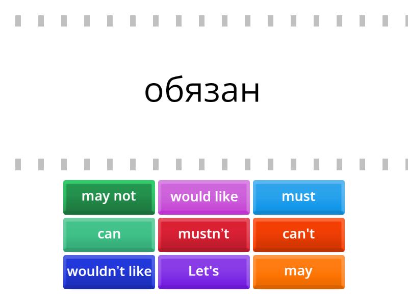 must - обязан , mustn’t - нельзя, запрет, may - можно, разрешено , may not - не разрешено, would like - хотел бы , wouldn’t like - Не хотел бы , can - уметь, can't - не уметь, Let's - Давай!,