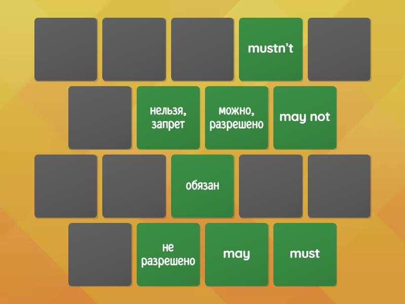 must - обязан , mustn’t - нельзя, запрет, may - можно, разрешено , may not - не разрешено, would like - хотел бы , wouldn’t like - Не хотел бы , can - уметь, can't - не уметь, Let's - Давай!,