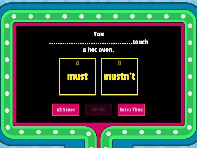 1) You ......................................touch a hot oven. a) must b) mustn't 2) He has got a toothache. He .....................................go to the dentist. a) should b) shouldn't 3) You ..................................play with the fire. a) must b) mustn't 4) He should .............................hard because he has an exam. a) study b) studies c) studied d) studying 5) You must .................................... your room. a) clean b) cleans c) cleaned d) cleaning