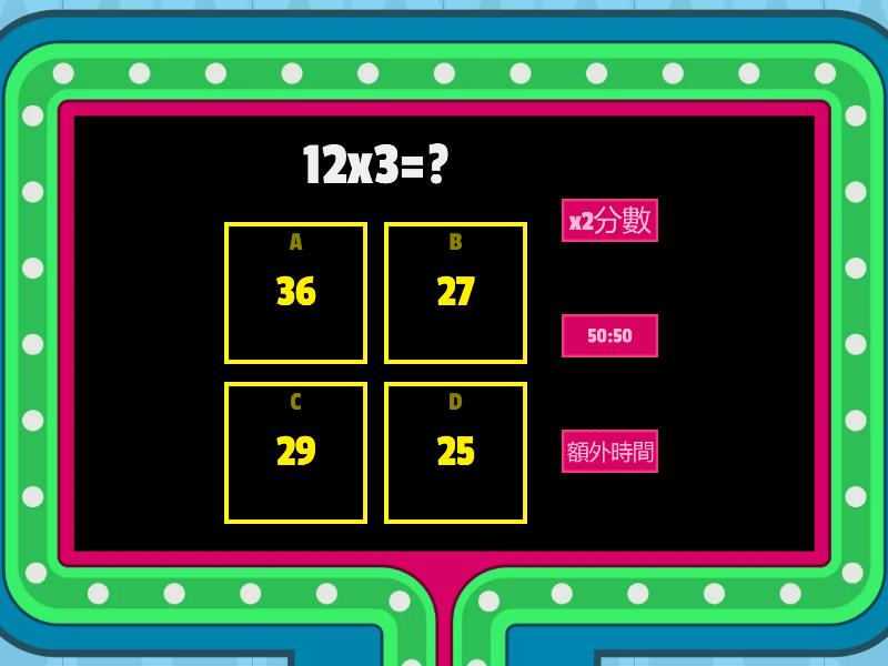 1) 12x3=? a) 36 b) 27 c) 29 d) 25 2) 14x2=? a) 20 b) 26 c) 28 d) 30 3) 36x4=? a) 167 b) 152 c) 144 d) 198 4) 22x4=? a) 135 b) 120 c) 101 d) 88 5) 50x3=? a) 150 b) 100 c) 250 d) 280 6) 70x2=? a) 105 b) 140 c) 90 d) 80 7) 20x5=? a) 70 b) 85 c) 90 d) 100 8) 30x3=? a) 100 b) 50 c) 90 d) 40 9) 60x2=? a) 140 b) 120 c) 160 d) 170 10) 終極題:100x15x12=? a) 18000 b) 19000 c) 12000 d) 20000