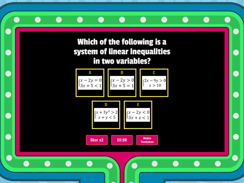 1) Which of the following is a system of linear inequalities in two variables? a) b) c) d) e) 2) Manakah dari gambar di bawah ini yang merupakan grafik penyelesaian sistem pertidaksamaan linear dua variabel y<2x-2 dan x<1/2 y+3 ? a) b) c) d) e) 3) Jika x dimisalkan sebagai lama waktu belajar Matematika dan y sebagai lama waktu belajar Bahasa Inggris (keduanya dalam satuan jam), maka grafik di atas akan merepresentasikan waktu seorang siswa untuk belajar Matematika dan Bahasa Inggris, dengan catatan … a) Ia harus belajar selama 24 jam dan membutuhkan waktu setidaknya 3 kali lebih lama untuk belajar Bahasa Inggris daripada Matematika. b) Ia memiliki waktu kurang dari 24 jam dan membutuhkan waktu setidaknya 3 kali lebih lama untuk belajar Matematika daripada Bahasa Inggris. c) Ia memiliki waktu kurang dari 24 jam dan membutuhkan waktu setidaknya 3 kali lebih lama untuk belajar Bahasa Inggris daripada Matematika. d) Ia memiliki waktu tidak lebih dari 24 jam dan membutuhkan waktu setidaknya 3 kali lebih lama untuk belajar Matematika daripada Bahasa Inggris. e) Ia memiliki waktu tidak lebih dari 24 jam dan membutuhkan waktu setidaknya 3 kali lebih lama untuk belajar Bahasa Inggris daripada Matematika. 4) Fara adalah seorang mahasiswa yang sedang kuliah di luar negeri. Ia memiliki dua pekerjaan untuk membayar biaya kuliahnya. Pertama, ia bekerja sebagai barista di kedai kopi dengan bayaran $7/jam dan kedua sebagai tutor pribadi dengan bayaran $11/jam. Karena jadwal kuliahnya yang padat, ia tidak bisa bekerja lebih dari 14 jam per minggu. Jika ia harus menghasilkan setidaknya $140 per minggu, manakah dari pilihan dibawah ini yang sebaiknya dijalani oleh Fara? (Diadaptasi dari Kirk, D. 2023. Contemporary Mathematics. Texas: OpenStax) a) Bekerja sebagai barista selama 6 jam dan sebagai tutor selama 5 jam per minggu. b) Bekerja sebagai barista selama 5 jam dan sebagai tutor selama 9 jam per minggu. c) Bekerja sebagai barista selama 10 jam dan sebagai tutor selama 4 jam per minggu. d) Bekerja sebagai barista selama 4 jam dan sebagai tutor selama 12 jam per minggu. e) Bekerja sebagai tutor selama 14 jam per minggu. 5) Siska is selling bread and pudding to earn money. Each bread costs Rp5.000,00 and each pudding costs Rp7.000,00. She needs to sell at least 15 pieces of bread and needs to earn at least Rp130.000,00. Let x be the number of bread she needs to sell and y be the number of pudding. (Adopted from Luarez, M. C. D. 2020. Mathematics Quarter 2 – Module 4: Solving Systems of Linear Inequalities in Two Variables. Filiphina: Department of Education). Which of the following system of linear inequalities in two variables to represent the situation? a) b) c) d) e)