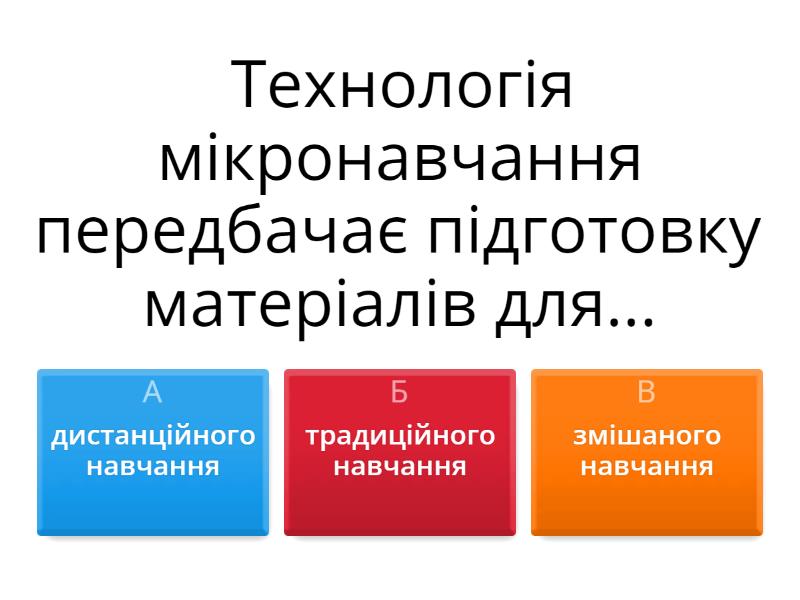 1) Технологія мікронавчання передбачає підготовку матеріалів для... a) традиційного навчання b) змішаного навчання c) дистанційного навчання 2) Технологія мікронавчання передбачає a) візуалізацію кожного етапу уроку b) опрацювання лише теоретичного матеріалу c) демонстрацію відео до кожного етапу уроку 3) Тривалість самостійного вивчення одного етапу уроку триває ... a) до 20 хвилин b) до 5-10 хвилин c) обмежень не існує