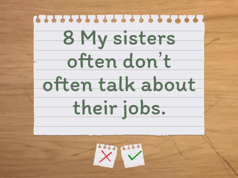1 I often sing often in the car., 2 My brother and sister often don’t often read books., 3 My friends and I usually on Saturdays go for coffee on Saturdays., 4 I don’t often don’t draw pictures., 5 My parents sometimes have sometimes dinner at my house., 6 I four times a week go to the gym four times a week., 7 My friends and I rarely go rarely to the cinema., 8 My sisters often don’t often talk about their jobs., 9 I don’t usually don’t drive to work., 10 I always am always tired in the evenings., 11 My friends every weekend play football every weekend., 12 I once a month go for a long bike ride once a month., 13 My grandparents don’t often don’t go online., 14 I don’t every evening go out every evening., 15 My friend and I once a month visit a museum once a month., 16 My sisters never cook never dinner., 17 My brothers always are always busy, 18 I watch every evening the news on TV every evening., 19 My parents always on Sundays visit us on Sundays., 20 I don’t usually at the weekends have breakfast at the weekends.,
