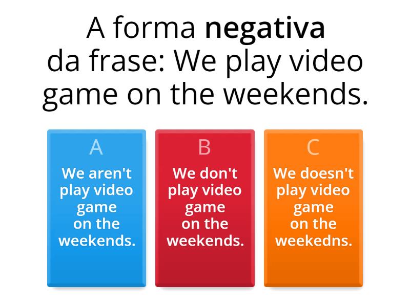 1) A forma negativa da frase: She is tall. a) She doesn't is tall. b) She isn't tall. c) She aren't tall. 2) A forma negativa da frase: Bruno likes pizza. a) Bruno doesn't likes pizza. b) Bruno isn't like pizza. c) Bruno doesn't like pizza. 3) A forma negativa da frase: We play video game on the weekends. a) We aren't play video game on the weekends. b) We don't play video game on the weekends. c) We doesn't play video game on the weekedns. 4) A forma negativa da frase: Vanessa and Pedro are my cousins. a) Vanessa and Pedro aren't my cousins. b) Vanessa and Pedro don't my cousins. c) Vanessa and Pedro isn't my cousins. 5) A forma negativa da frase: I draw manga. a) I'm not manga. b) I don't draw manga. c) I doesn't draw manga.