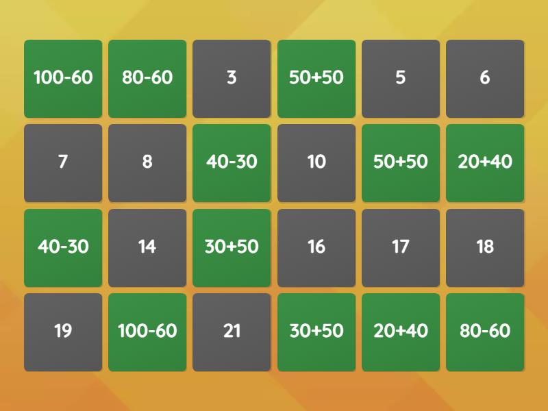 20+40, 30+50, 40-30, 100-60, 50+50, 80-60, 70-10, 90-50, 80-70, 50+30, 60+10, 40+40,