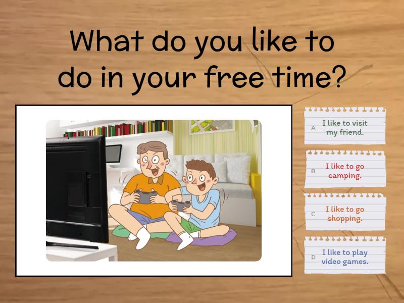 1) What do you like to do in your free time? a) I like to visit my friend. b) I like to go camping. c) I like to go shopping. d) I like to play video games. 2) What do you like to do in your free time? a) I like to ride a bike. b) I like to go camping. c) I like to go shopping. d) I like to watch TV. 3) What does he like to do in his free time? a) He likes to ride a bike. b) He likes to dance and watch TV. c) He likes to visit his friend. d) He likes to play basketball. 4) What does she like to do in her free time? a) She likes to go camping. b) She likes to dance. c) She likes to visit her friend. d) She likes to ride a bike. 5) I like to go shopping in my free time. a) What does she like to do in her free time? b) What do you like to do in your free time? c) Where do you like to do in your free time? d) What do you likes to do in your free time? 6) She likes to visit her friend. a) What does she like to do in her free time? b) What do she like to do in her free time? c) What does he like to do in his free time? d) What do you like to do in your free time? 7) He likes to play basketball in his free time. a) What does she like to do in my free time? b) What do he likes to do in her free time? c) What does he like to do in his free time? d) What do you like to do in your free time? 8) A: What does Sam like to do in his free time? B: He likes to read, and he also likes to ride a bike. a) b) c) d)