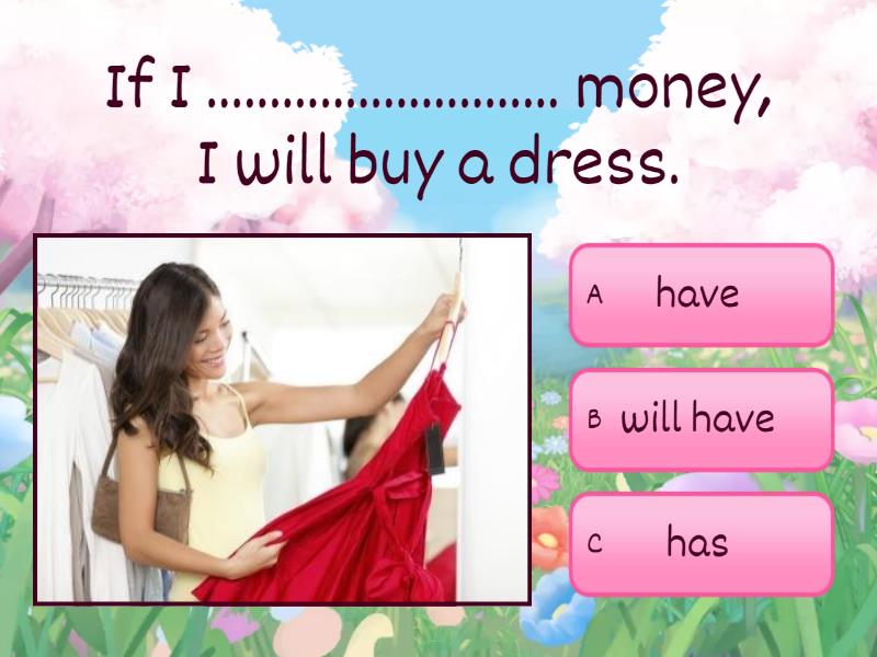 1) If I ............................ money, I will buy a dress. a) have b) will have c) has 2) If Peter .......................................the car, he will be happy. a) wash b) will wash c) washes 3) If Monica ..........................a lot of money, she'll buy a new house. a) wins b) win c) will win 4) If my children ................................their homework, the teacher will be sad. a) doesn't do b) don't do c) won't do 5) If my friend ....................................to Paris, he will go to London. a) doesn't go b) don't go c) won't go 6) If my sister....................................her room, she ...................................a film. a) will tidy/will watch b) tidies/will watch c) tidies/ watches 7) If my cousins ..............................computer games, they .............................football. a) will play/will play b) won't play/will play c) don't play/ will play 8) If my friend .........................................pizza, he ....................................it. a) don't cook/will buy b) doesn't cook/buy c) doesn't cook/ will buy 9) If my friends ................................ me, we .........................................to cinema. a) doesn't visit / won't go b) visit me/ will go c) don't visit/ won't go 10) If Barbara ................................to her teachers, she ...............................................better marks. a) doesn't listens/will get b) listens/ will get c) don't listen/will get