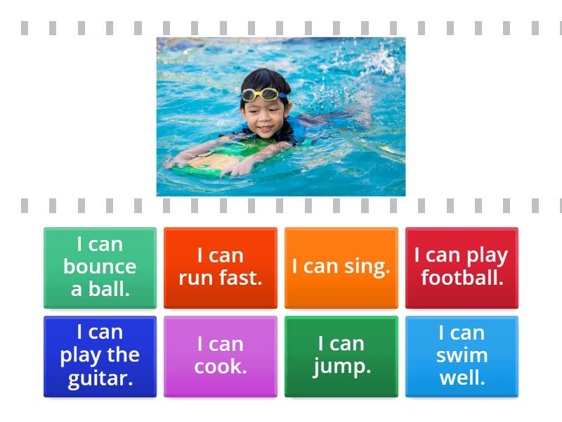 I can swim well. , I can play football. , I can sing., I can jump. , I can cook., I can play the guitar., I can bounce a ball., I can run fast. ,