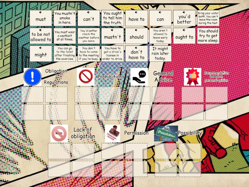 Obligation / Regulations: You have to get a drive's license in order to drive., have to, You must wear a seatbelt at all times., must, Prohibition: You aren't allowed to leave early today., to be not allowed to, You mustn't smoke in here., mustn't, General Advice: You should try to get more sleep., should, You ought to tell him the truth., ought to, Recommendation based on personal opinion: You'd better check the weather before you leave., you'd better, Lack of obligation: You don't have to come to the meeting if you're busy., don't have to, Permission: You can go to the toilet after finishing the exercise., can, Bring your water bottl. You can't leave the room during the test., can't, Possibility: It might rain later today., might,