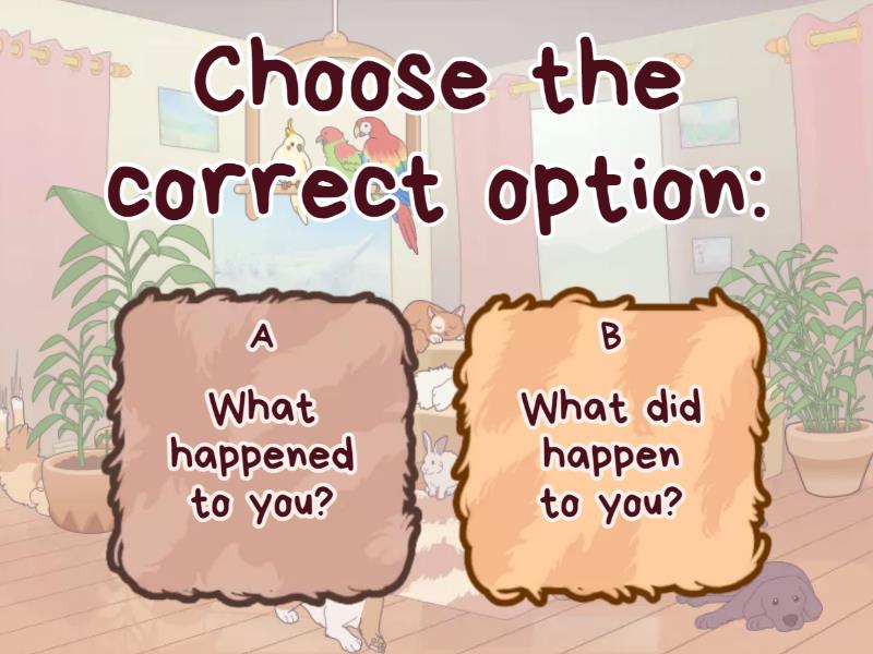 1) Choose the correct option: a) What happened to you? b) What did happen to you? 2) Choose the correct option: a) What means this word? b) What does this word mean? 3) Choose the correct option: a) Who you want to see? b) Who do you want to see? 4) Choose the correct option: a) Which bus goes to town? b) Which bus does go to town? 5) Choose the correct option: a) Which film won the Oscar this year? b) Which film did win the Oscar this year? 6) Choose the correct option: a) What said the teacher? b) What did the teacher say? 7) Choose the correct option: a) Who made this cake? It's fantastic! b) Who did make this cake? It's fantastic! 8) Choose the correct option: a) Which American singer died on 25th June 2009? b) Which American singer did die on 25th June 2009? 9) Choose the correct option: a) What invented Peter Durand in 1810? b) What did Peter Durand invent in 1810? 10) Choose the correct option: a) Who played Jack Sparrow in Pirates of the Caribbean? b) Who did play Jack Sparrow in Pirates of the Caribbean?