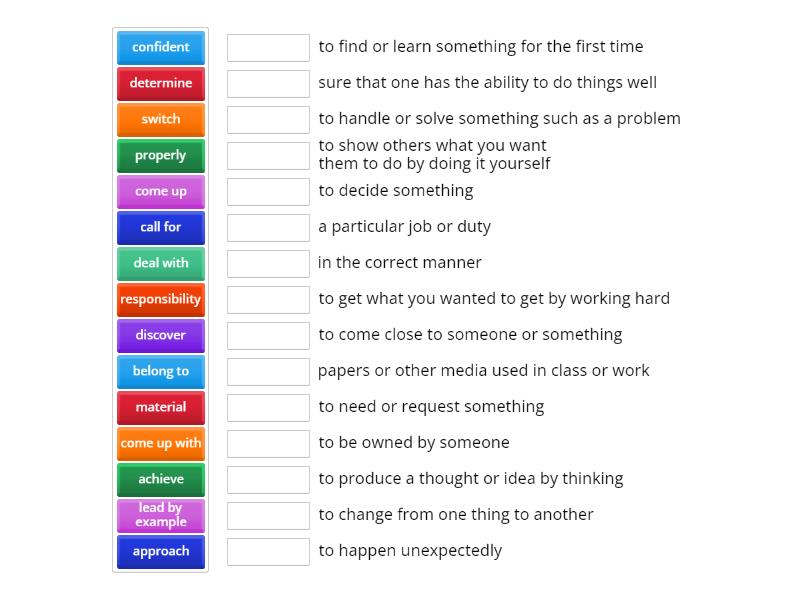 achieve - to get what you wanted to get by working hard, properly - in the correct manner, lead by example - to show others what you want them to do by doing it yourself, approach - to come close to someone or something, come up with - to produce a thought or idea by thinking, deal with - to handle or solve something such as a problem, belong to - to be owned by someone, come up - to happen unexpectedly, call for - to need or request something, determine - to decide something, responsibility - a particular job or duty, confident - sure that one has the ability to do things well, discover - to find or learn something for the first time, material - papers or other media used in class or work, switch - to change from one thing to another,