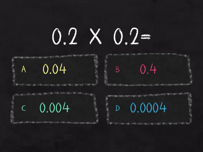 1) 0.2 X 0.2= a) 0.04 b) 0.4 c) 0.004 d) 0.0004 2) 7.1 X 0.7 = a) 49.7 b) 4.97 c) 0.497 d) 0.0497 3) 1.9 X 1.8 = a) 0.342 b) 34.2 c) 3.42 d) 0.0342 4) 3.3 X 0.2 = a) 0.06 b) 66 c) 6.6 d) 0.66 5) 4.8 X 0.4 = a) 1.92 b) 19.2 c) 0.192 d) 1.9 6) 0.02x0.3= a) 6 b) 0.6 c) 0.06 d) 0.006 7) 0.5x0.7= a) 35 b) 0.35 c) 3.5 d) 0.035 8) 0.11x0.2= a) 0.022 b) 0.22 c) 222 d) 0.222 9) 0.03x0.1= a) 0.003 b) 0.03 c) 0.3 d) 3 10) 0.6x0.8= a) 48 b) 0.48 c) 4.8 d) 0.048 11) 0.4x0.3= a) 12 b) 0.012 c) 1.2 d) 0.12 12) 0.9x0.02= a) 18 b) 1.8 c) 0.18 d) 0.018 13) 0.07x0.2= a) 0.14 b) 14 c) 0.014 d) 1.4 14) 0.2x0.02= a) 4 b) 4.0 c) 0.04 d) 0.004 15) 0.01x0.08= a) 0.8 b) 0.08 c) 0.008 d) 0.0008