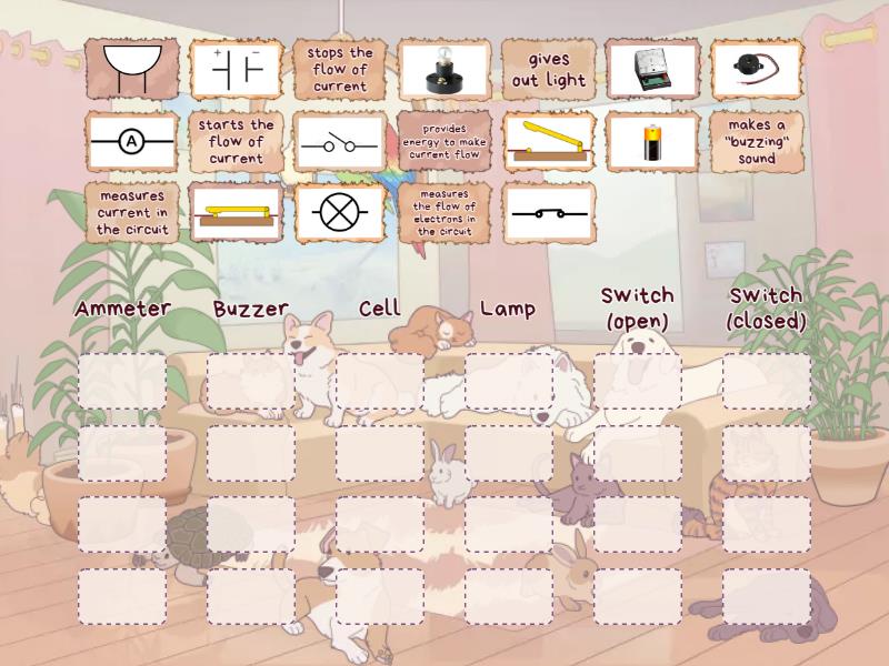Ammeter: , , measures current in the circuit, measures the flow of electrons in the circuit, Buzzer: , , makes a "buzzing" sound, Cell: , , provides energy to make current flow, Lamp: , , gives out light, Switch (open): , , stops the flow of current, Switch (closed): , , starts the flow of current,