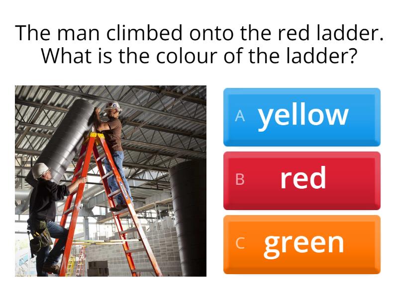 1) The man climbed onto the red ladder. What is the colour of the ladder? a) yellow b) red c) green 2) I am resting under the tree. Where am I resting at? a) On my bed b) On the floor c) Under the tree 3) We will be camping on the hill. Where will we be camping? a) on the ground b) on the hill c) beside the school 4) The corner of the note is torn. Which part of the note is torn? a) the middle b) the bottom c) the corner 5) John will yell when he is hungry. What will John do when he is hungry? a) cry b) shout c) yell