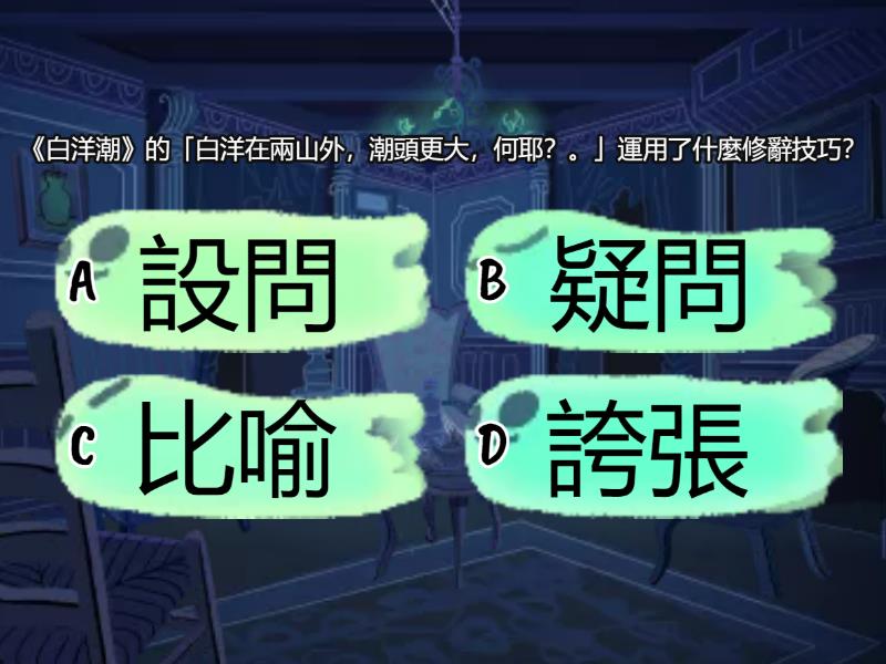 1) 《白洋潮》的「白洋在兩山外,潮頭更大,何耶?。」運用了什麼修辭技巧? a) 設問 b) 疑問 c) 比喻 d) 誇張 2) 《風雪中的背平》,「但是一路上棋子般大的泥塊,夾着粉末似細沙......」 a) 比喻 b) 反問 c) 誇張 d) 擬人 3) 《從今天起》,「今天的是推到明天,明天又推到後天,一天一天地拖下去,我們還有造成功的時候嗎?」 a) 反問 b) 設問 c) 頂真 d) 勸喻